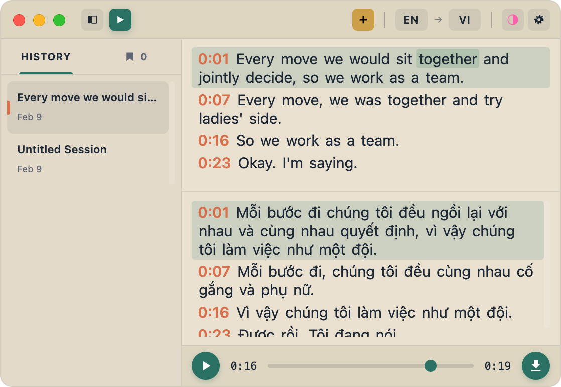 - Automatically sets the correct language based on your transcript's source language